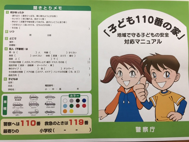 警察などに通報する、地域ぐるみで子ども達の安全を守っていく活動です。