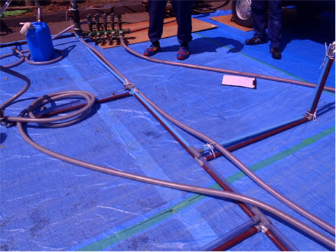 この研修会では、給水管更生工法では、マンション専有部給水管と同等の配管を配置して